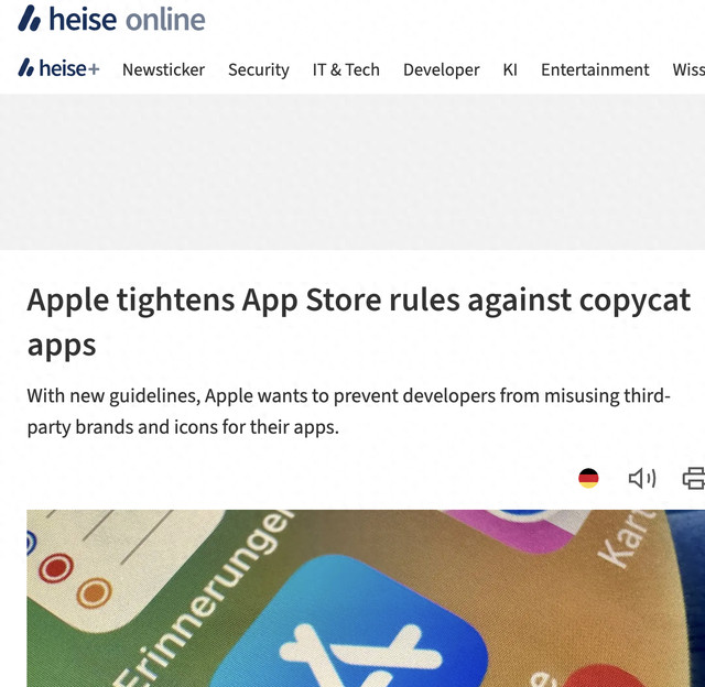 [环球网科技综合报道]11月15日消息,据外媒heiseonline报道称,苹果公司日前更新《AppStore审核指南》,推出多项新规,重点打击抄袭、山寨应用行为,强化知识产权保护,并对贷款应用、AI数据共享、未成年人内容管理等方面作出严格规范。